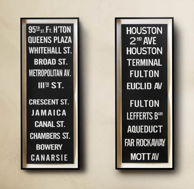 These subway signs, tokens of New York City, are $795 each from Restoration Hardware.